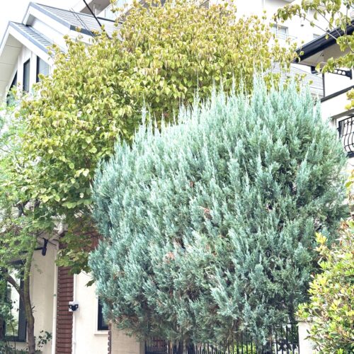 手前がコニファーのブルーエンジェル、奥の背の高い樹が、落葉のヤマボウシです。