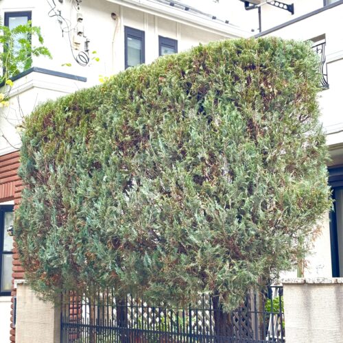 まずは奥の成長の早い、ヤマボウシを最大限小さくしてから、ブルーエンジェルを刈り込むと
