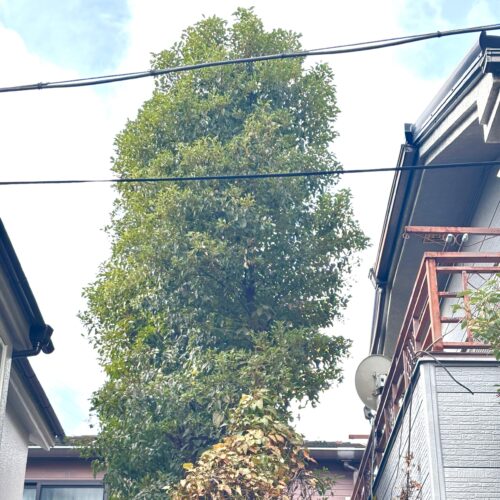 屋根の高さまで大きくなったクスノキを超強剪定します